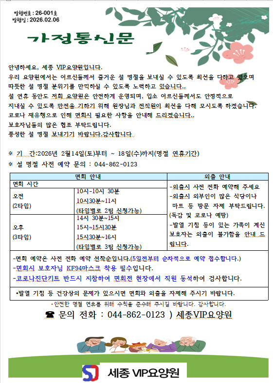 2026년 2월 가정통신문 페이지 정보 작성자 최고관리자 댓글 0건 조회 202회 작성일 26-02-09 18:08 본문 2026년 2월 가정통신문 목록 답변 글쓰기 이전글[프로그램] 2026년 2월 1주차 활동 모습 26.02.10 다음글[프로그램]2026년 1월 4주차 활동모습 26.02.05 댓글목록 댓글목록 등록된 댓글이 없습니다.